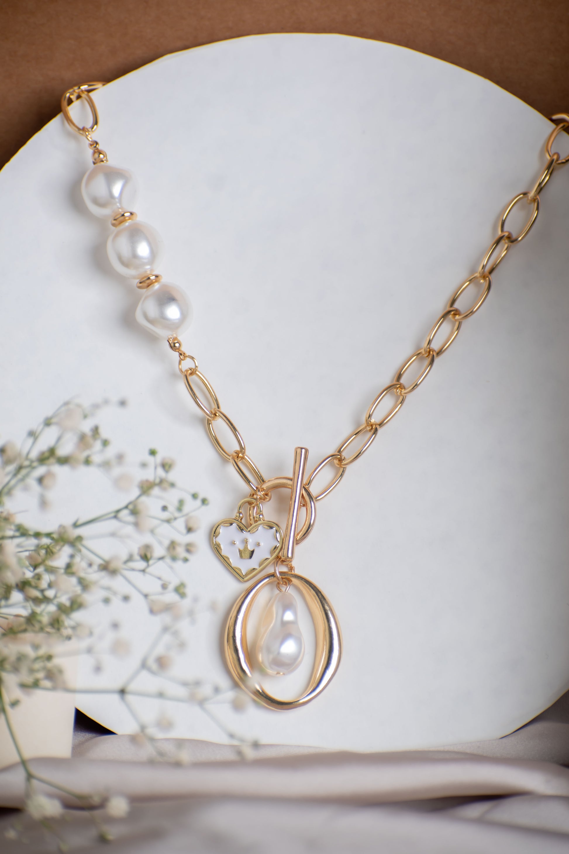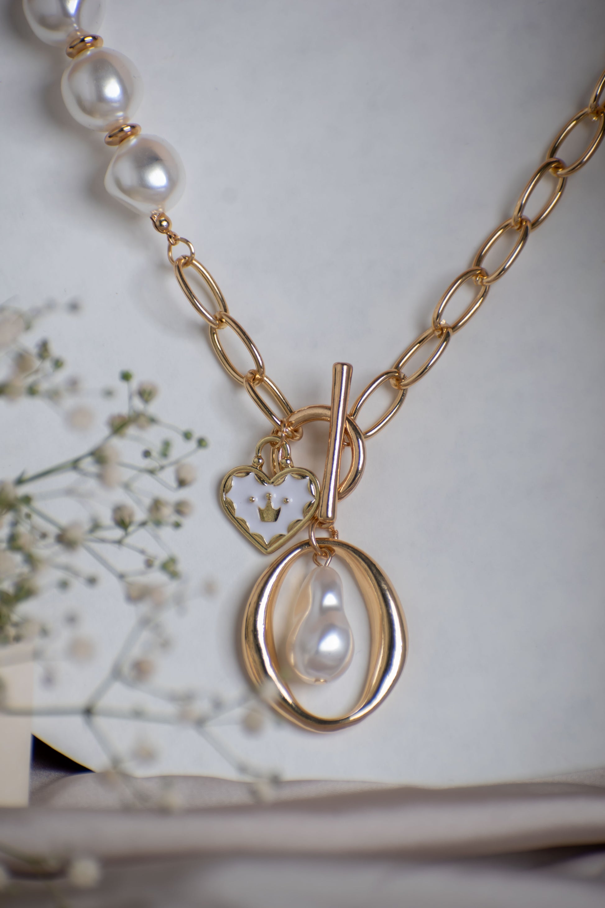 Fall in love with our Entwined Heart necklace! This stunning piece features a lustrous pearl and gold design with a delicate lock charm. Its unique and feminine style is sure to add a touch of elegance to any outfit. Treat yourself or a loved one today and show off your sophisticated taste!